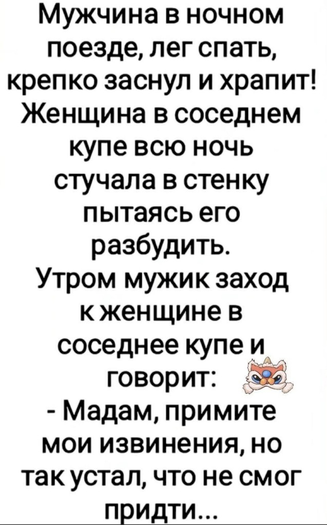 На следующее утро ситуация повторяется. Мужик приходит вечером домой, и рассказывает про всё жене. Та ему говорит: забей, мол, мало ли кругом всяких идиотов. На следующее утро мужик снова стоит на остановке, мимо пробегает тот же спортсмен, щёлкает его по носу и укоризненно говорит: