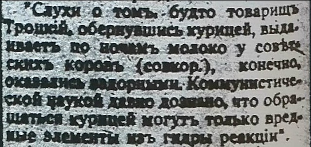 Слухи о томъ, будто товарищь Троцкій, обернувшись хурицей, выда. иваеть по ночамь молоко у совін скихъ коровъ (совкор.), конечно, оказьлись вадорными. Коммунистической каукой давно дозньно, ито обра- шяться курицей могуть только вредные элементы илъ гидры реакцін".