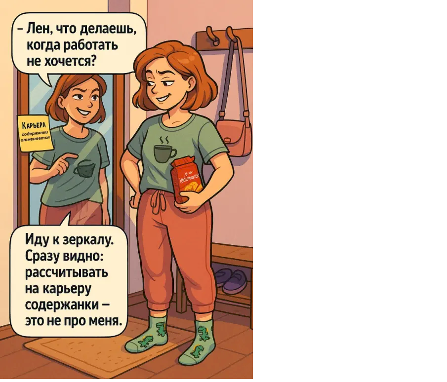 Вот сидишь ты допустим на своей кухне, картоху чистишь, и заодно просветляешься, выуживая всякое из недр Ютуба.И вдруг, бах! Чётко поставленный, в меру приятный голос уверенно так заявляет: «Вы должны полюбить себя!»Приехали… А я картоху чищу. А в это время, оказывается, могла бы себя любить, между прочим.А дальше продолжается: «Делайте себе каждый день приятные мелочи. Побалуйте свою маленькую девочку, загляните внутрь себя, спросите, что она хочет прямо сейчас».Я заглянула. Никто не ответил. Я заглянула ещё раз.Из глубины сознания послышалось недовольное ворчание, девочка попросила не заниматься фигнёй, а доготовить ужин.«Похоже, малышка не на шутку проголодалась», — подумала я и продолжила создавать кружева из картофельной кожуры.Голос в Ютубе не унимался: «Все ваши сиюминутные маленькие хотелки, в которых вы так часто себе отказывали, — это, на самом деле, её желания. Прислушайтесь к ней, что она вам говорит?»- Хочу вина, игристого, — отчётливо слышу я голос изнутри.- У всех девочки, как девочки, а у меня… похоже, — алкаш Валера, — сокрушаюсь я.— И пиццу..! — не хочу картошку…— Не бросать же на середине, давай приготовим, все потом поедят, — типа, отвечаю я маленькой себе.— Да ну их, им бы только хавать! Давай лучше возьмём паспорт и махнём куда-то подальше на выходных. А?— А как же муж, дети? — ошалело продолжаю я разговор с самой собой.— Оспадяяя, ну, куда они денутся? А мы зато отдохнём..! Море, закаты, шампанское! Ну, круто же будет. А?— Слушай, а ты точно маленькая? Тебе сколько годочков-то?— Сколько ни есть — все мои! Ты свои посчитай, тётя…— А ну-ка, не дерзи старшим! Ты посмотри на неё… Шагом марш в угол и подумай о своём поведении!— Так ты же сама…— Молчать! Завтра на работу рано, детей к стоматологу, английский…Шампанское — ей, закаты…… Ишь, ты