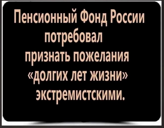 Наблюдала я такую сцену. Работяга о чем-то переругивается с бабками. Бабки говорят: «Эх, сынок, доживешь до пенсии — узнаешь!» Работяга: «Да как я работаю — я до нее не доживу!». Бабки: «Эх, сынок, все надеются, что не доживут! А потом доживают!»