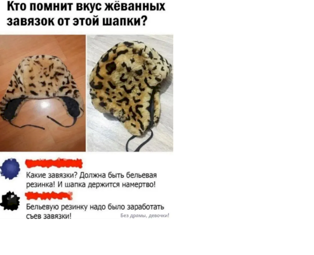 Завязки завязывали у подбородка, а резинка охватывала шапку у лба и щек. Это, чтобы не дуло в уши.
