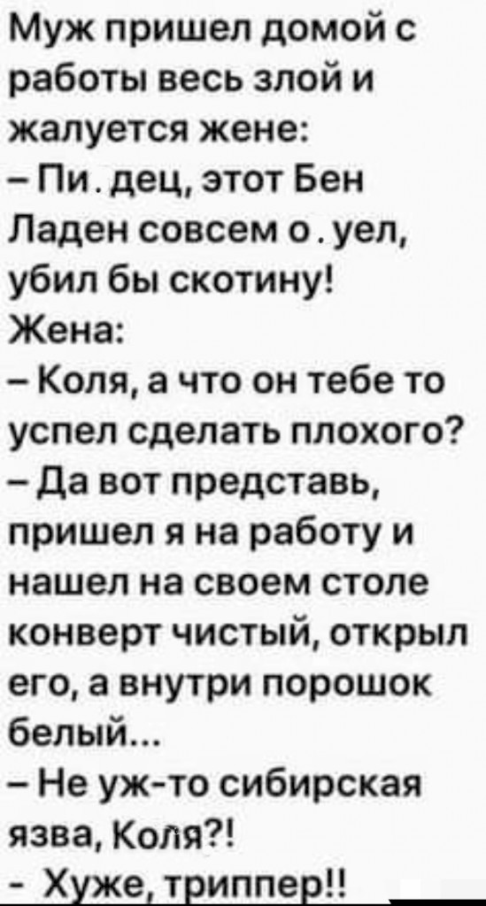 - А мой дурак на рыбалку попёрся.