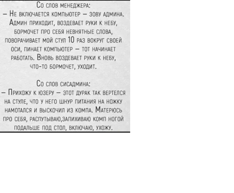Хозяин решил дать мне отпуск. Начал крутиться, отключил питание. Красота! Пришёл этот матершинник, пытался раскрутить хозяина, включил меня и прервал наш с хозяином отпуск...