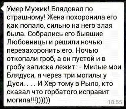 Он перепробовал все способы, чтобы отпугнуть воров, но ничего не помогало. Тогда он придумал такой способ: Вбил в центре арбузной бахчи кол и к нему прибил табличку и написал: