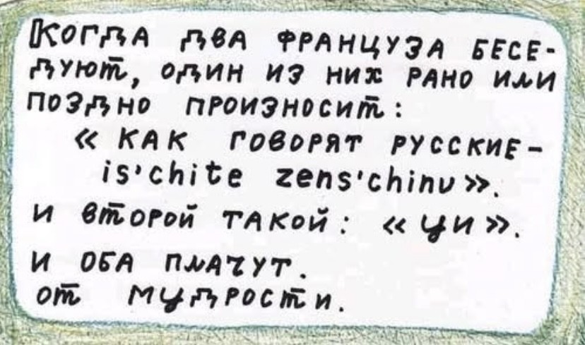 — Понимаете, муж уехал в каммандировку, а вчера прислал письмо, мол встретил другую, решил с ней там остаться, просит продать все его имушество, а деньги ему перевести. Кстати вам квартира трехкомнатная за 100 рублей не нужна?