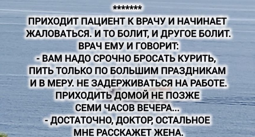 Разговаривают муж с женой. Жена: — У меня к тебе 2 новости — хорошая и плохая. С какой начать? С хорошей. — Подушка безопасности сработала хорошо.