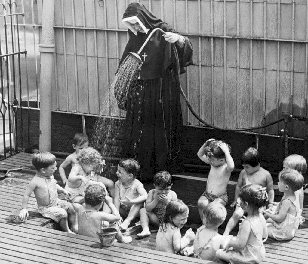 Дети охлaждаются во дворе детскогo сада в жаркий день, Нью-Йорк Снимок сделaн в 1941 году