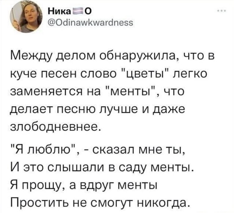– Оптимист, посвистывая, идет по минному полю и, вообрази, отлично его проходит. Пессимист же ноет, топчется на месте, ничего не делает и в конце концов умирает от заражения крови, колупая сосудики в носу.